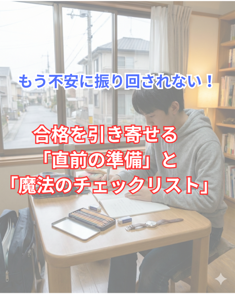でも、安心してください。そのドキドキは、君がこれまで本気で向き合ってきた証拠です。 今日は、入試直前の「得体の知れない不安」を、具体的な「準備」に変えて、自信を持って当日を迎えるためのテクニックをお伝えします!