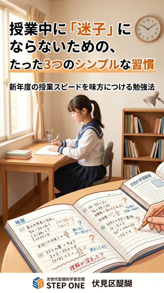 前回のブログでは、4月下旬に「授業が速い」と感じることの危険性についてお話ししました。今日は、実際に学校の授業を受けている最中に「置いてけぼり」にならないための、具体的でシンプルな解決策をお伝えします。