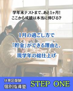 お役立ち情報 2025.01.252025.05.21 Useful Information お役立ち情報 35年以上の教員としての経験をもとにした、すぐに使える学習アドバイスが満載! 最新情報 テスト対策 学年末テストで過去最高点を!STEP ONE流の勉強戦略と集中空間 いつもブログを読んでくださり、ありがとうございます。STEP ONEの野末です。 記事を読む » 2026年1月24日 その他のアドバイス 学年末テストで成績が伸びる子の特徴は?伸びない子との決定的な違い いつもブログを読んでくださり、ありがとうございます。STEP ONEの野末です。 記事を読む » 2026年1月22日 テスト対策 学年末テストまであと1ヶ月!中1・中2が1月にすべき対策とは? いつもブログを読んでくださり、ありがとうございます。京都市伏見区醍醐の「次世代型 記事を読む » 2026年1月20日 勉強のコツ 逆転合格の秘訣は「やる気」じゃない?習慣化が最強の武器になる理由③ いつもブログを読んでいただき、ありがとうございます。 STEP ONEです。 & 記事を読む » 2026年1月17日 勉強のコツ 「わかったつもり」を卒業!成績アップを確実にする最強の勉強法② いつもブログを読んでいただき、ありがとうございます。 STEP ONEです。 & 記事を読む » 2026年1月15日 勉強のコツ 京都市伏見区の塾が教える!成績が上がる意外なタイミングとは?① いつもブログを読んでいただき、ありがとうございます。 京都市伏見区醍醐の個別指導 記事を読む » 2026年1月13日 受験のアドバイス 過去問の点数が悪い…叱る前に読んで!合格を引き寄せる「分析術」 いつもブログを読んでくださり、ありがとうございます。 「次世代型個別学習空間ST 記事を読む » 2026年1月10日 受験のアドバイス 私立入試まで1ヶ月!直前期に「新しい問題集」を買ってはいけない理由 いつもブログを読んでくださり、ありがとうございます。 「次世代型個別学習空間ST 記事を読む » 2026年1月8日 受験のアドバイス 始業式直前!冬休みの宿題「やり残し」で焦る親子の処方箋 いつもブログを読んでくださり、ありがとうございます。 京都市伏見区醍醐の「次世代 記事を読む » 2026年1月6日 その他のアドバイス さあ、ラストスパート!冬期講習は「あと3日」! こんにちは!STEP ONEの野末です。いつもブログを読んでくださり、ありがとう 記事を読む » 2026年1月4日 ページ1 ページ2 ページ3 ページ4 ページ5 LINEで問い合わせる まずはお試し体験から 座席に限りがあるため、定員になり次第、募集を締め切ります。 お問い合わせはお早めに!